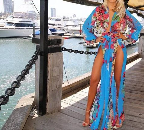 Long Sleeve Women Chiffon Deep V Beach Dress