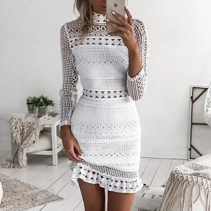 Material: Lace Gender: Women Item Type:Dress Color: White Size: S, M, L, XL