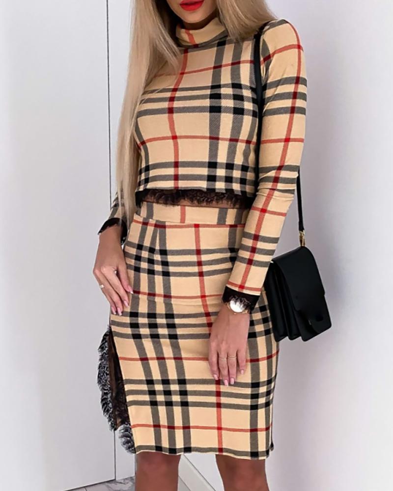 Tight-Fitting Plaid Printed Long-Sleeved Lace Two-Piece Dress