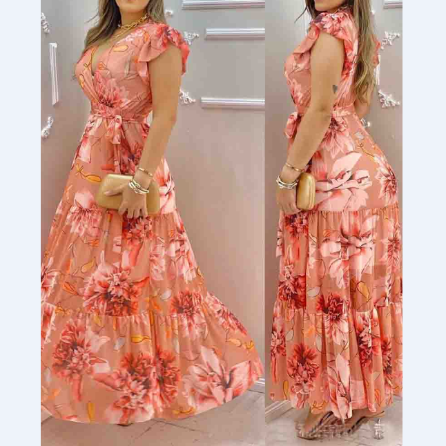 Pink Printed V-Neck Chiffon Dress