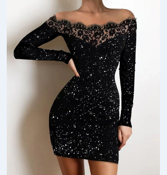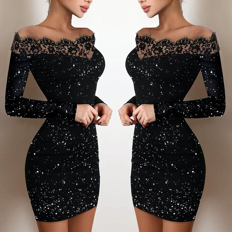 Fashion Black Off-The-Shoulder Sequin Lace Skinny Long Sleeve Dress