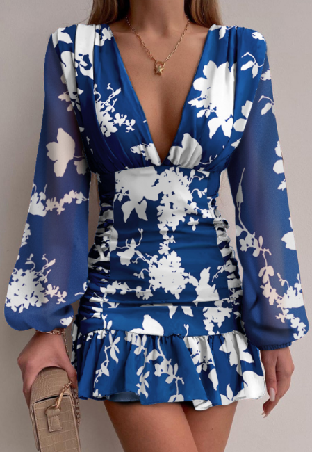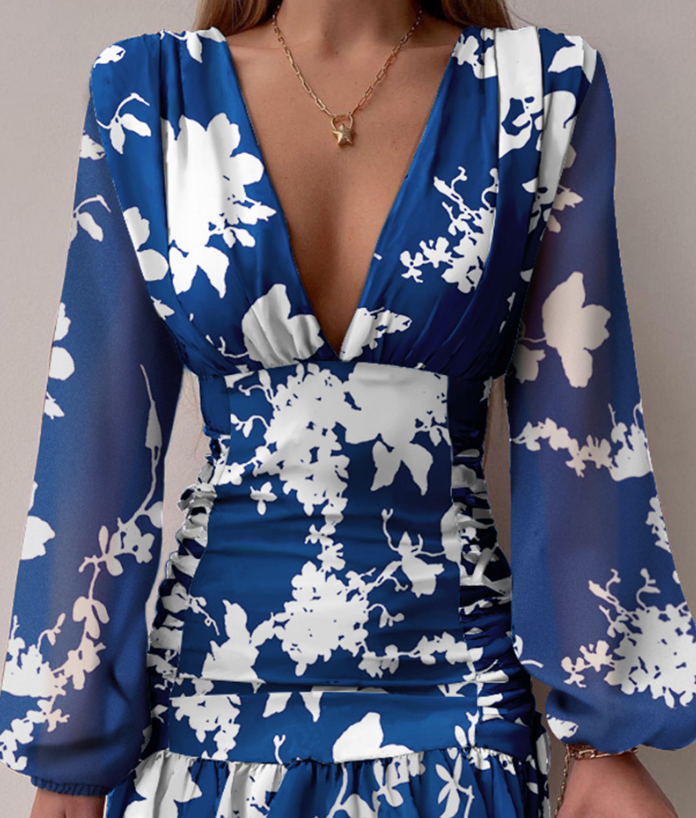 Women's V-Neck Printed Puff Sleeve Dress