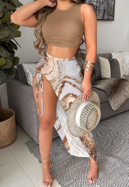Solid Color Printed Sleeveless Two Piece Set