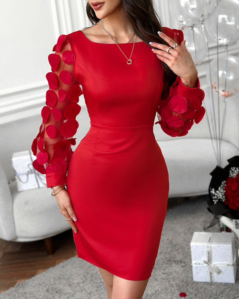 Red Mesh Jacquard Backless Casual Long Sleeve Dress