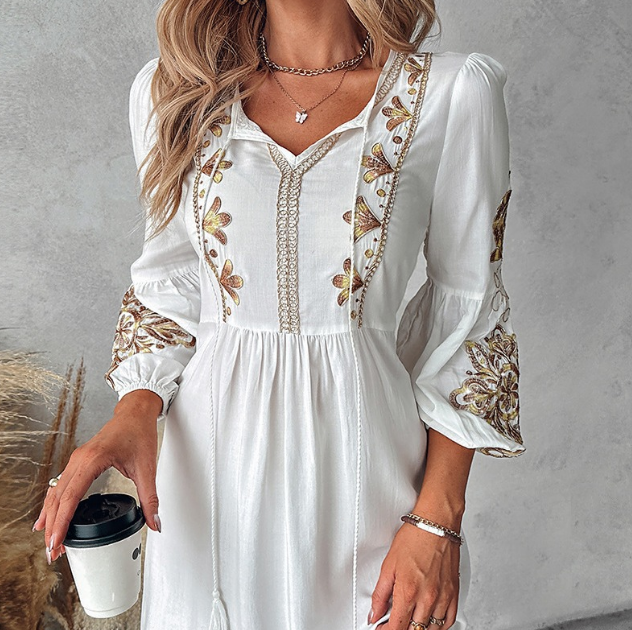 Solid Color Women'S Embroidered Casual Long Sleeved Dress