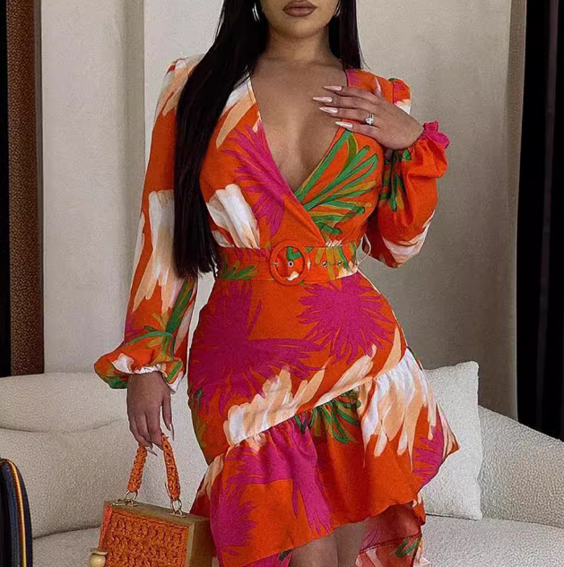 Long Sleeves Red Printed Dress