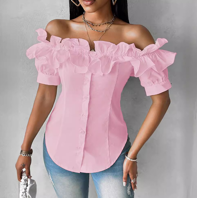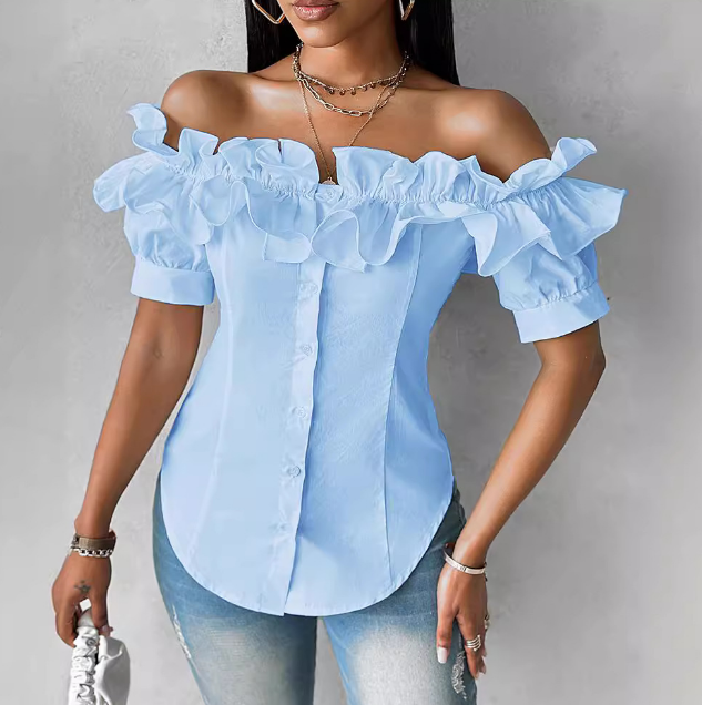 One Shoulder Lotus Leaf Edge Short Sleeved Shirt