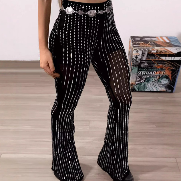 Black Sexy Mesh Rhinestone Design High Waisted Tight Flared Pants