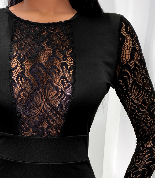Elegant Temperament Long Sleeved Lace Stitching Package Hip Dress